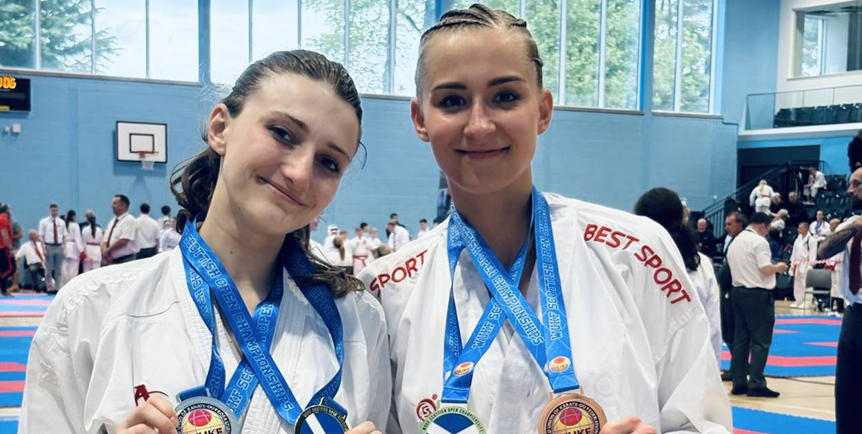 Aleksandra Zgórecka i Maria Kowalewska z Klubu Karate Raion z medalami Scottish Open Championships.