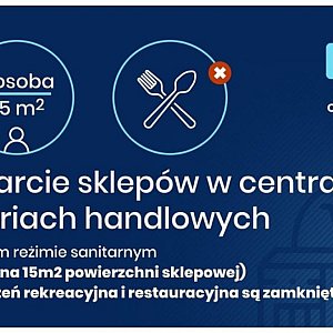Uwaga! W centrach handlowych nie mogą funkcjonować jednak kluby fitness i przestrzeń rekreacyjna (np. place zabaw). Nie mogą funkcjonować także miejsca, w których spożywa się posiłki na miejscu (tzw. food court).
