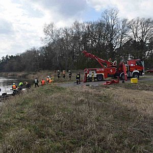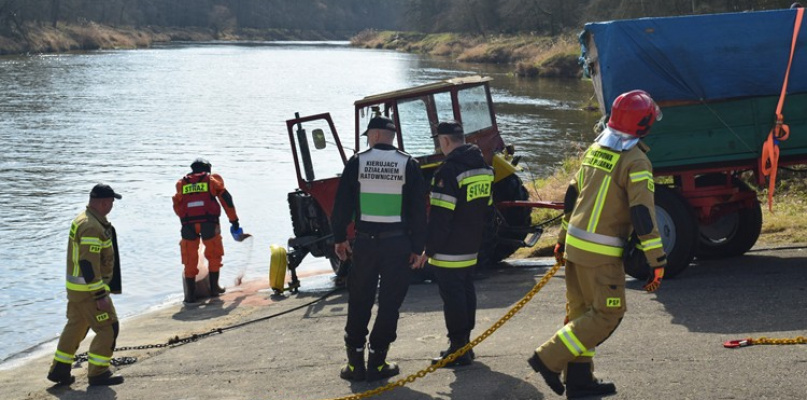Po blisko czterech godzinach od chwili zgłoszenia wypadku, strażakom udało się wydobyć na brzeg ciągnik z przyczepą.