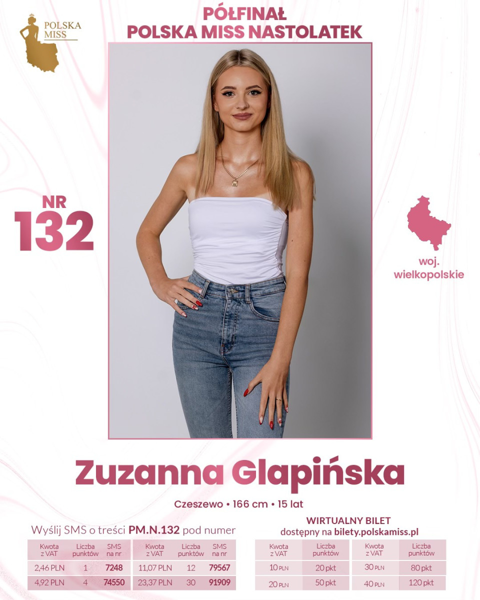 Zuzanna Glapińska ma 15 lat i jest mieszkanką Czeszewa w gminie Miłosław. Uczęszcza do Liceum Ogólnokształcącego im. Powstańców Wielkopolskich w Środzie Wlkp. do klasy medycznej. To pierwsza jej przygoda z konkursem piękności, który rozpoczął się w lutym. Zuzanna przeszła przez kolejne etapy, a teraz staje przed możliwością zakwalifikowania się do finału. O tym, kto się w nim znajdzie, zadecyduje jury, które wybierze 27 nastolatek. Jest też głosowanie dla internautów, którzy mogą wskazać swoje faworytki. Trzy z nich, które uzyskają największą liczbę głosów, też zakwalifikują się do finału konkursu Polska Miss Nastolatek 2025. Głosowanie trwa do środy 15 października, do godziny 21:00. Aby oddać głos na Zuzannę, należy wysłać płatną wiadomość SMS o treści PM.N.132 na numer premium wskazany na poniższym plakacie.