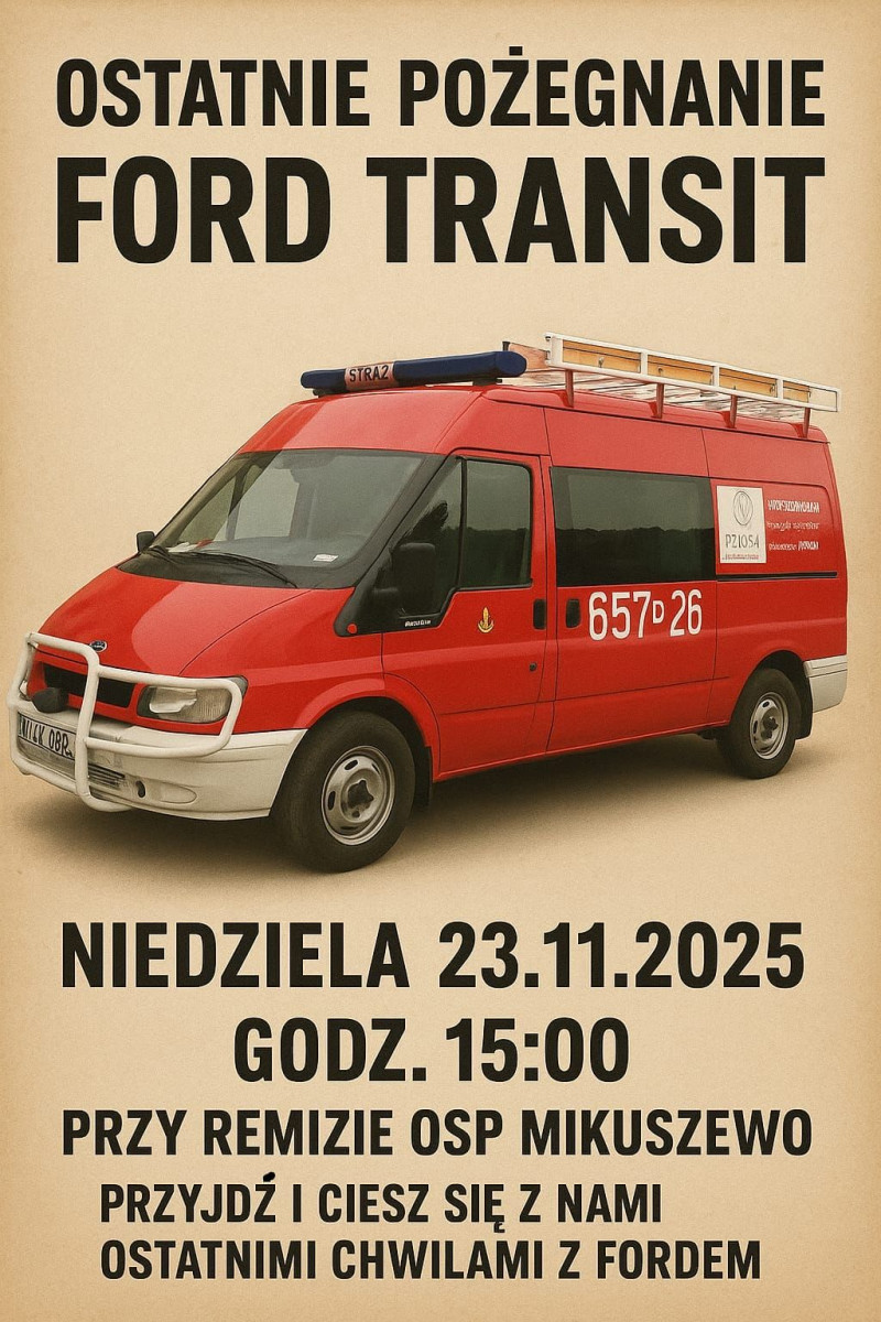 W najbliższą niedzielę, 23 listopada, przy remizie OSP Mikuszewo odbędzie się „Ostatnie pożegnanie forda transita”. Początek wydarzenia o godzinie 15:00.