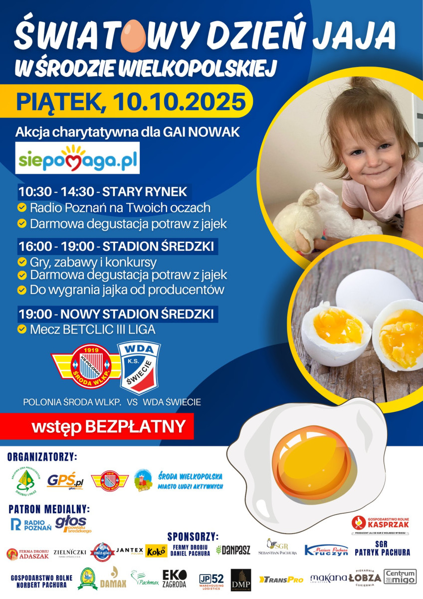 W związku z przypadającym w piątek Światowym Dniem Jaja Wielkopolska Izba Producentów Drobiu i Pasz, Klub Sportowy Polonia Środa, Urząd Miejski w Środzie i Głos Powiatu Średzkiego organizują pierwsze średzkie obchody tego święta. Pierwsza część wydarzenia rozpocznie się w piątek 10 października o godzinie 10:30 na Starym Rynku i potrwa cztery godziny. Posłuchacie o wpływie jaj na zdrowie, a dzieci wezmą udział w grach, zabawach i konkursach. Nie zabraknie oczywiście potraw z jajek. O Wasze żołądki zadbają restauracje i Koła Gospodyń Wiejskich.