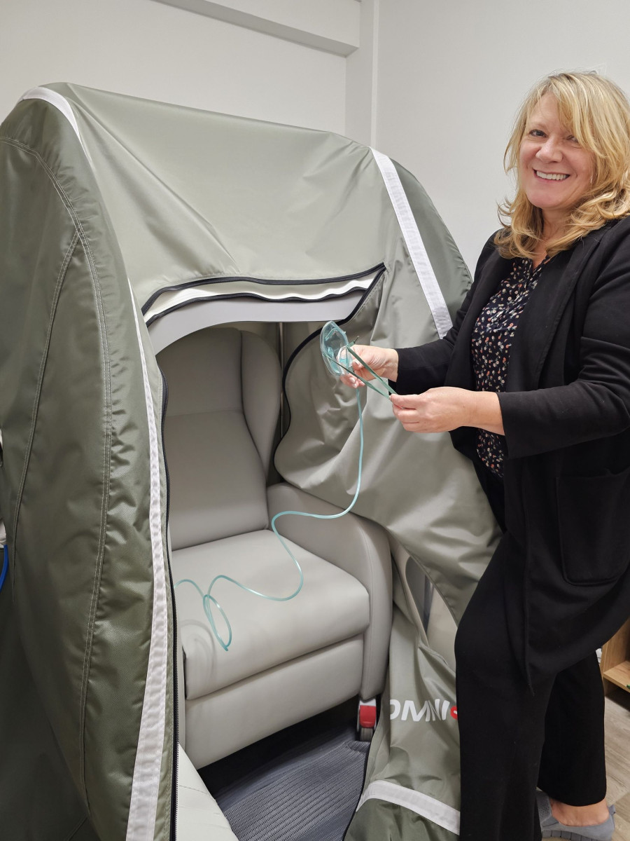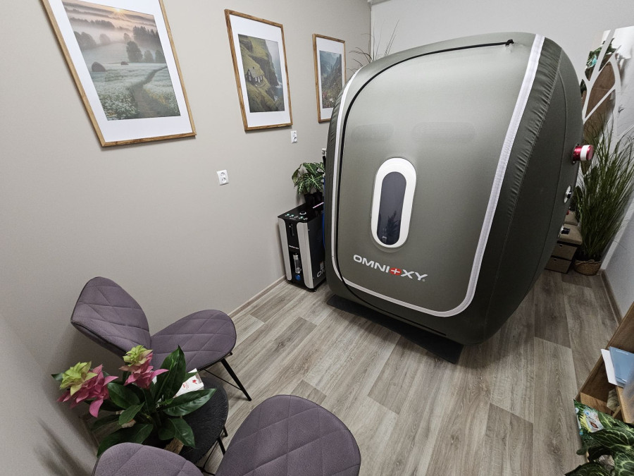 Sesja w komorze hiperbarycznej (HBOT) polega na oddychaniu powietrzem wzbogaconym w tlen w podwyższonym ciśnieniu. W praktyce to po prostu godzina relaksu w przestronnym namiocie, który po napełnieniu daje dużo swobody. Do komory można wjechać także na wózku inwalidzkim, co sprawia, że terapia jest dostępna dla każdego.