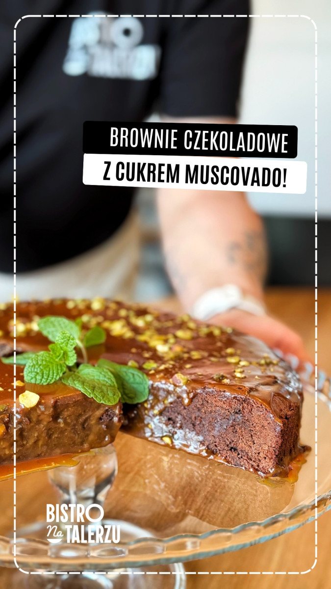 - Brownie czekoladowe z cukrem muscovado — wilgotne wnętrze, delikatna karmelowa nuta, polewa ze słonego karmelu i pistacje, które nadają mu wyjątkowego charakteru.