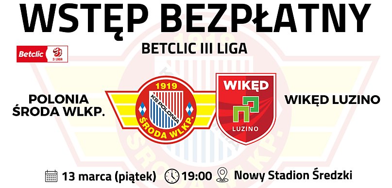 Przed kibicami Polonii pierwsze wiosenne ligowe emocje w Środzie! W piątek, 13 marca o godzinie 19:00, średzki zespół zmierzy się na Nowym Stadionie Średzkim z Wikędem Luzino w ramach rozgrywek Betclic III Liga. Co ważne dla kibiców – wstęp na spotkanie będzie bezpłatny.