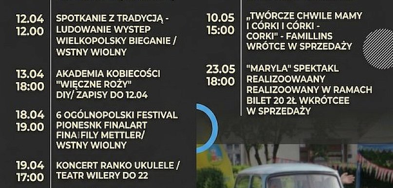 Wiosna w Ośrodku Kultury im. Marsz. J. Piłsudskiego w Środzie Wielkopolskiej zapowiada się wyjątkowo intensywnie. Od mocnych uderzeń punk rocka, przez rodzinne warsztaty i rajdy samochodowe, aż po spektakle teatralne i festiwale piosenki – każdy znajdzie coś dla siebie. Zapoznaj się ze szczegółowym harmonogramem na kwiecień i maj 2026.